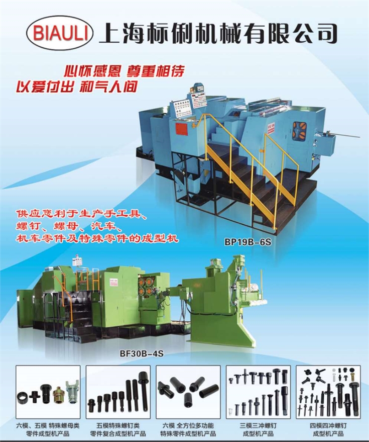 KING ANN,founded in 1994,is a professional manufacturer of cold-forming machines which produce bolts,nuts,hand tools,automotive & motorcycle parts,and other special parts.King Ann´s markets include: Taiwan, China, Brazil and several South East Asian countries,though King Ann´s machines can also be found in other parts of the world including:Germany,Poland,Turkey,Korea,lran,lndia,ltaly and many more.In response to continued business demands and market trends,in 2001,Shanghai Biau Li Machinery Co., LTD,a branch in Shanghai China,was established.Biau Li is to facilitate the business expansion for the chinese market.Our main products include 3,4 and 5 Station Bolt Former,5 and 6 station Special Parts Former,5 and 6 Station Short Parts Former ,5 and 6 Station Long Stroke Nut Former.